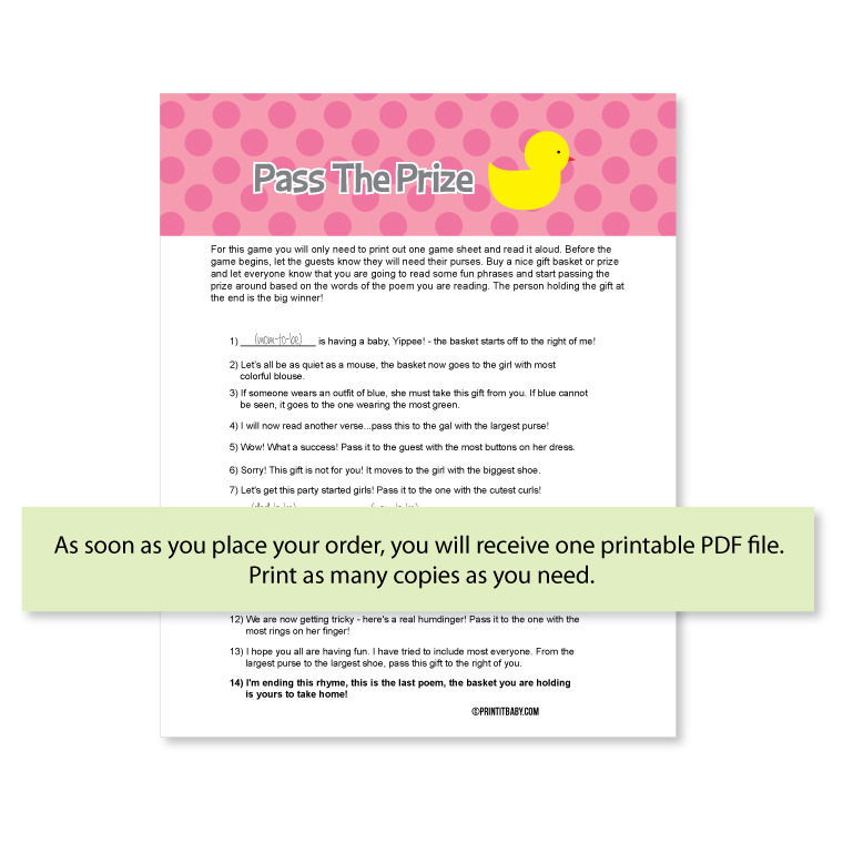 How the pass the gift baby shower game is played is starting with the host they read a poem out loud and a gift is passed around from person to person based on what is said in the pass the prize baby shower game is all that because you need nothing but the free printout and one wrapped gift. Pass them out to guests before the gifts are opened, and have them fill in the squares with the kinds. At the end of the poem the person holding the gift gets to keep it. Sure, baby shower games are tons of fun to play just for the sake of playing them, but a virtual shower doesn't have to mean sacrificing prizes for the winners. If you're after great baby shower games, look no further!