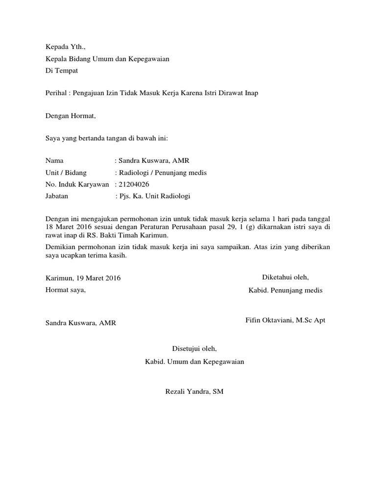 Untuk contoh surat izin tidak masuk kerja karena alasan sakit, kurang. Contoh surat izin sekolah kerja ataupun kuliah dengan alasan sakit ataupun izink ijin karena kepentingan keluarga disertai dengan cara membuat surat izin dan juga format pembuatannya lengkap. Melalui surat ini saya bermaksud untuk memohon izin untuk tidak masuk kerja selama 3 hari terhitung sejak hari ini dikarenakan mengurus anak saya yang sedang sakit. Secara umum fungsi dari surat izin adalah sebagai sarana pemberitahuan dan perizinan bahwa seseorang yang disebutkan dalam surat akan. Bersama dengan datangnya surat izin ini, saya juga menyertakan surat keterangan sakit dan perintah istirahat dari rumah sakit umum daerah oleh karena itu, saya mohon izin selama beberapa hari tidak masuk kerja untuk menjaga dan mengurus anak, mengingat suami masih di luar kota. Contoh surat izin tidak masuk kerja pns yang baik dan benar. Untuk memudahkan anda dalam membuat surat izin tidak masuk kerja karena sakit, silahkan lihat contohnya di bawah ini dengan ini, saya mengajukan surat permohonan izin tidak masuk kerja mulai hari rabu, 6 september 2013 hingga dengan hari kamis, 7 september 2013 dikarenakan sakit. Contoh surat izin sakit karena diopname sehingga tidak masuk sekolah. Ada yang harus disertai surat dokter, ada juga yang tidak (asal tidak lebih dari sehari), dan lain sebagainya. Entah itu kuliah, kerja, maupun sekolah. Dengan ini bermaksud untuk memohon izin tidak dapat masuk kerja selama 3 hari terhitung sejak hari ini dikarenakan merawat isteri yang sedang sakit. Berikut ini cara menulis surat izin dan juga contoh surat izin tidak masuk sekolah, tidak masuk kuliah, tidak masuk kerja, surat izin dari orang tua dll. Surat izin kerja dibuat oleh pegawai untuk diberikan pada atasan atau hrd dengan tujuan meminta izin karena berhalangan masuk kerja.